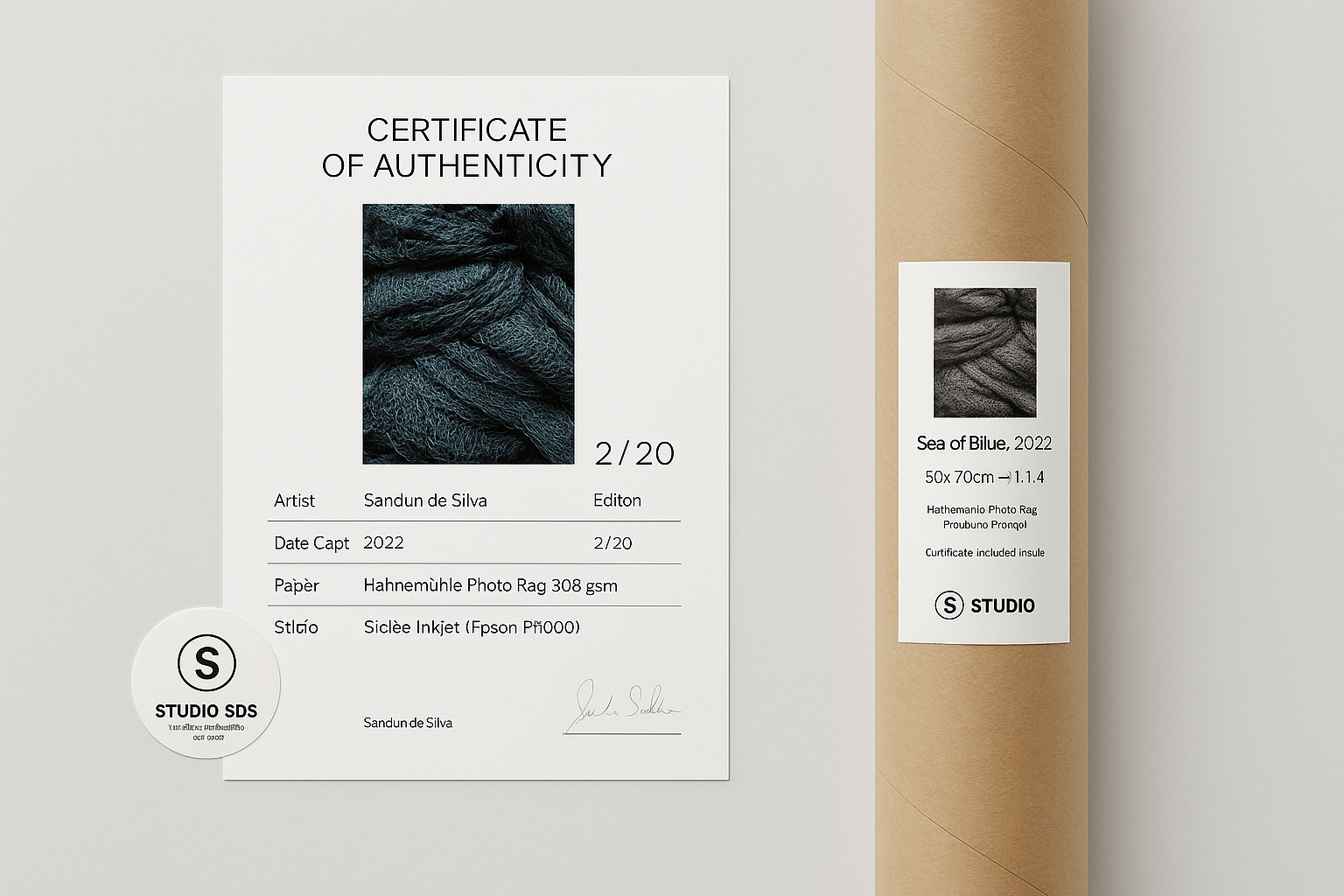 Prints are available on Pro Premium Archival Matte or Hahnemühle Photo Rag, selected for their tonal depth, surface character, and long-term archival performance. Every work is accompanied by a Studio SDS Certificate of Authenticity, with Hahnemühle editions including the official hologram certificate.
